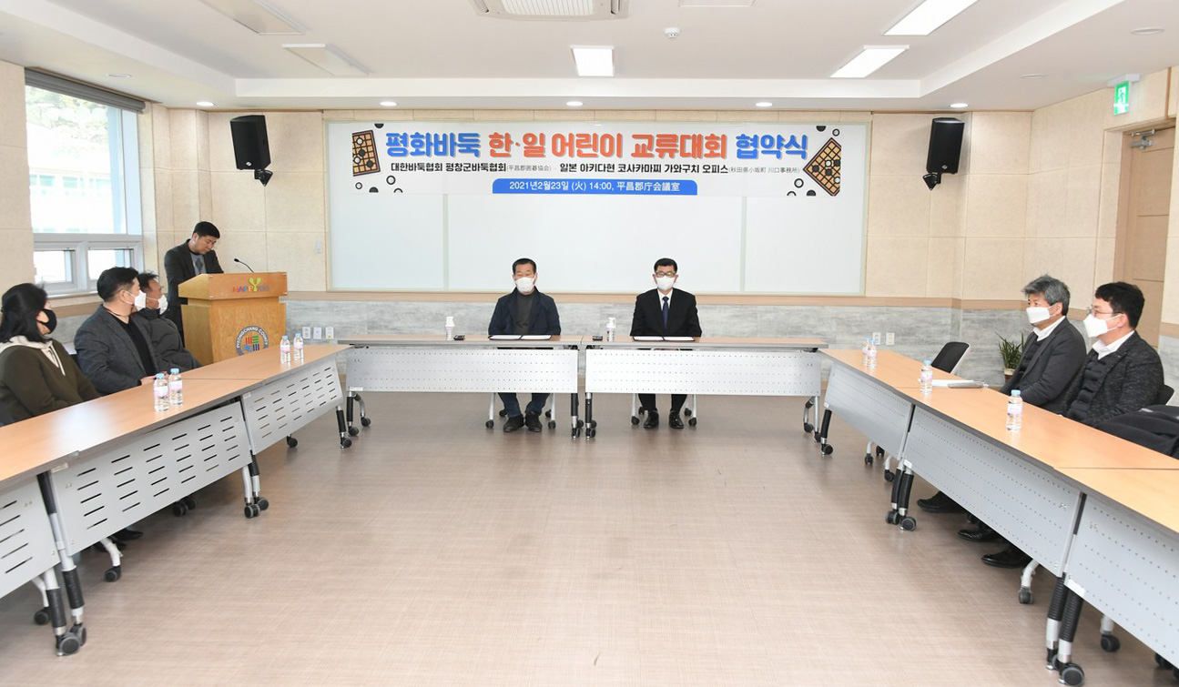 23일 대한바둑협회 평창군바둑협회와 일본 아키다현 코사카마찌 가와구치 오피스간 평화바둑 한· 일 교류대회 협약식이 군청 신관회의실에서 신형구 평창군바둑협회장, 김종구 KOSAKA-RE 공동대표 등 관계자 10여 명이 참석한 가운데 있었다. (평창포토뉴스 김춘호)