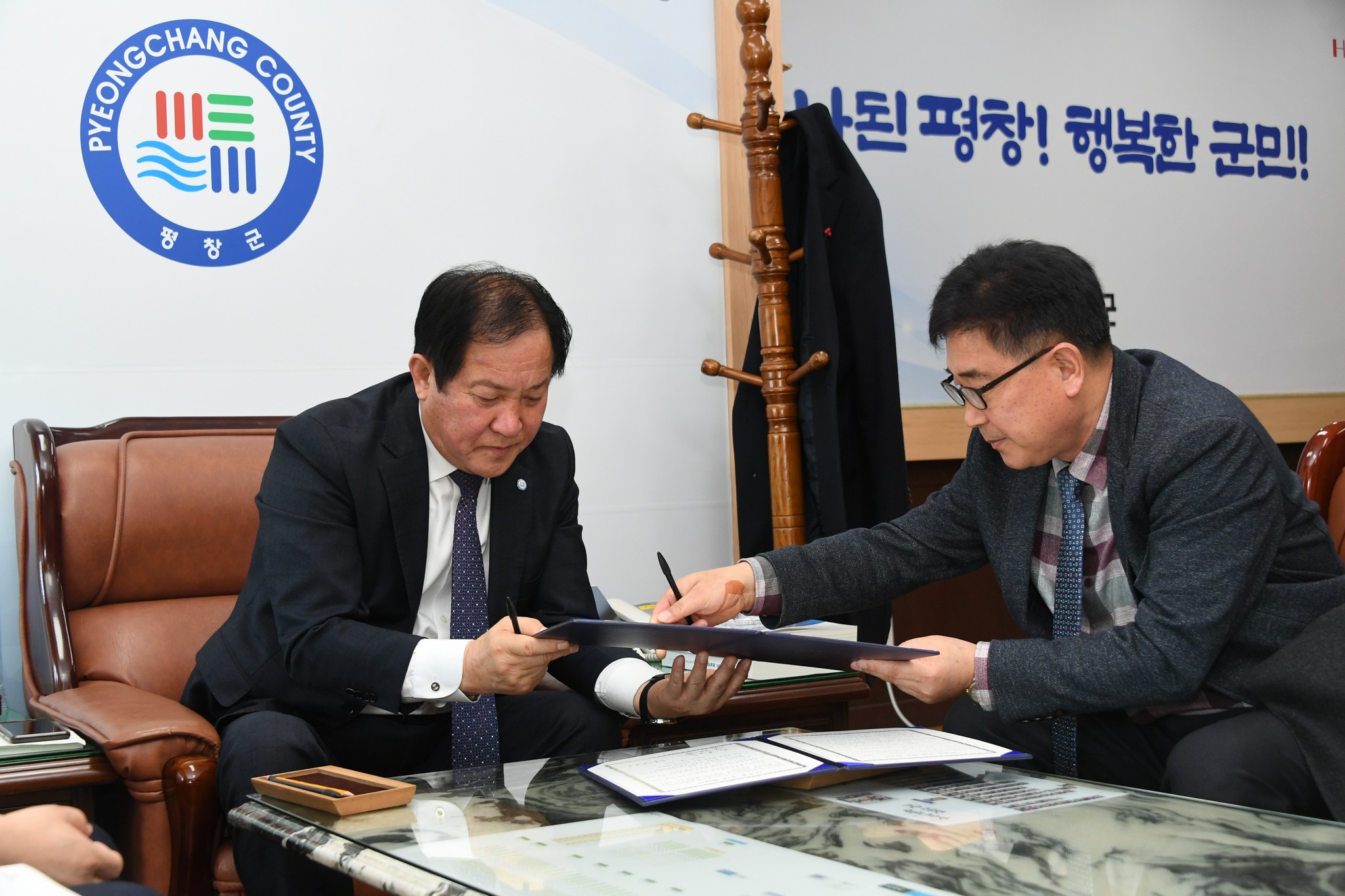 14일 평창군과 평창초등학교는 학생들의 자연친화적 학습공간 제공을 위한 학교숲 조성사업 협약식을 군수 집무실에서 심재국 평창군수와 김기성 교장, 윤봉태 교감이 참석한 가운데 가졌다. (평창포토뉴스 김춘호)