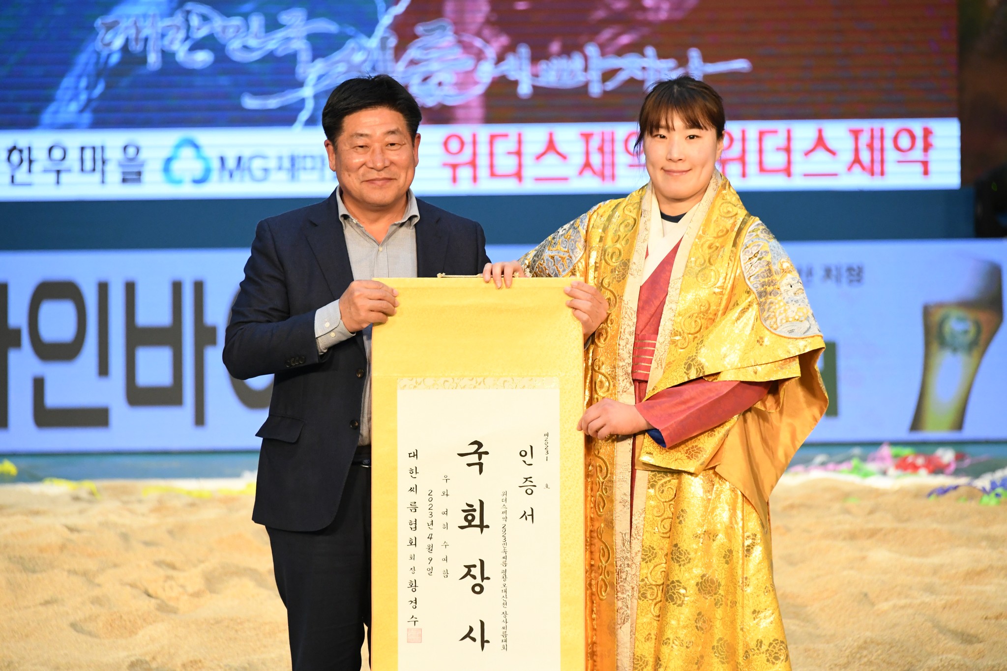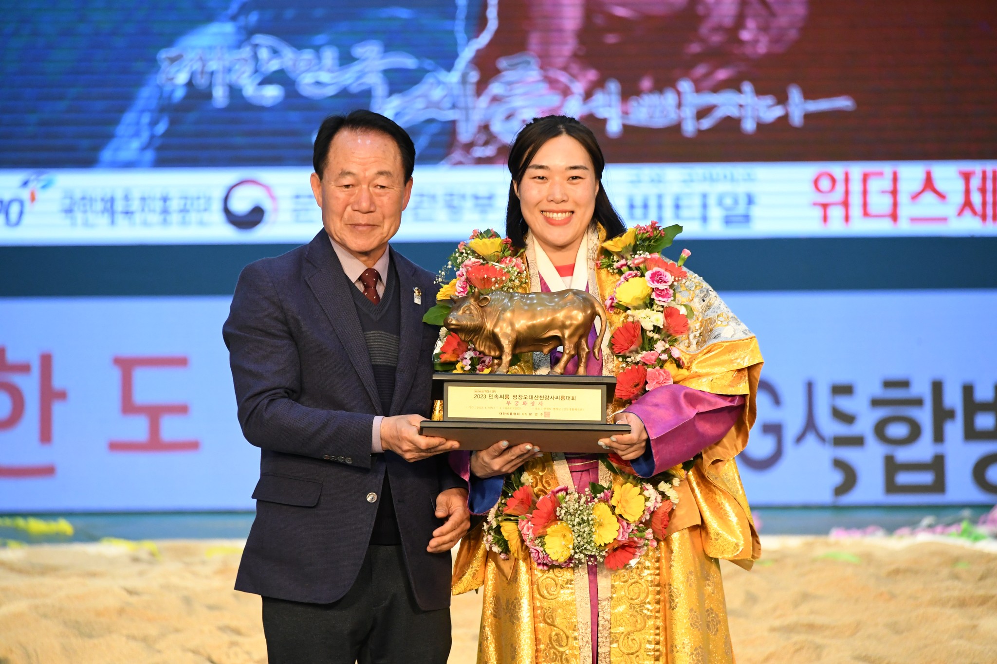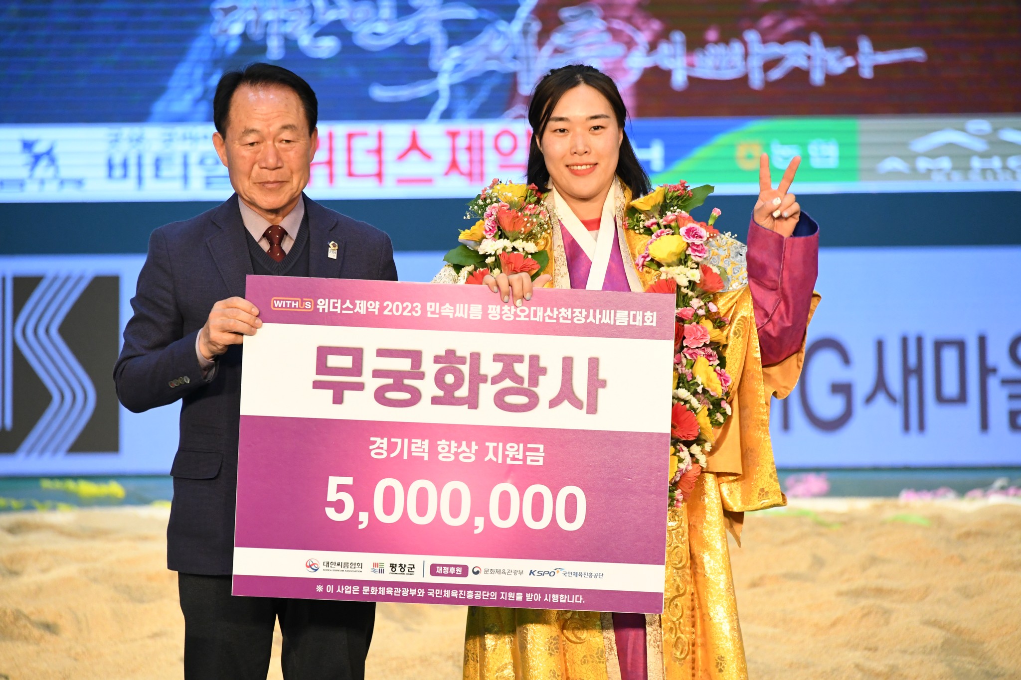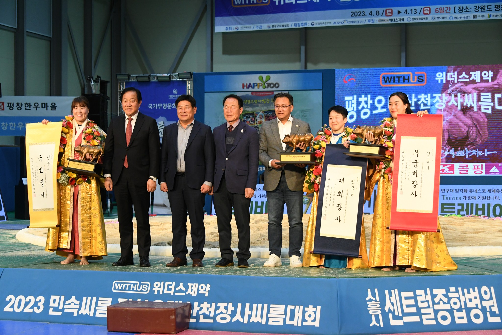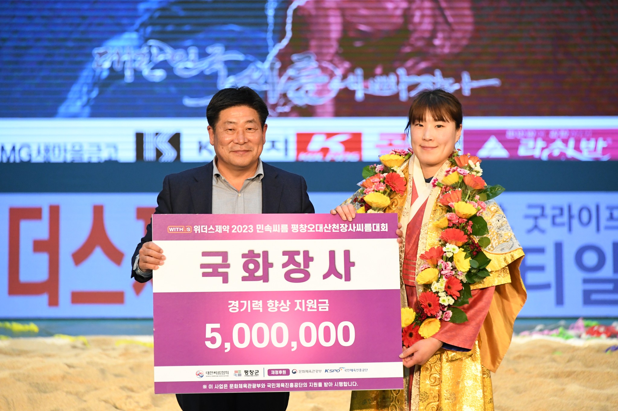 9일 저녁 위더스제약2023 민속씨름 평창오대산천천하장사 씨름대회 개회식 및 여자 단체전과 개인전 경기가 진부면 체육공원 특설실내씨름경기장에서 열린 가운데 여자단체전 우승에 거제시청이, 매화장사(60kg이하)에 이재하(안산시청) 선수가, 국화장사(70kg이하) 임수정(영동군청) 선수가, 무궁화장사(80kg이하)에 이다현(거제시청) 선수가 우승을 차지했다. (평창포토뉴스 김춘호)