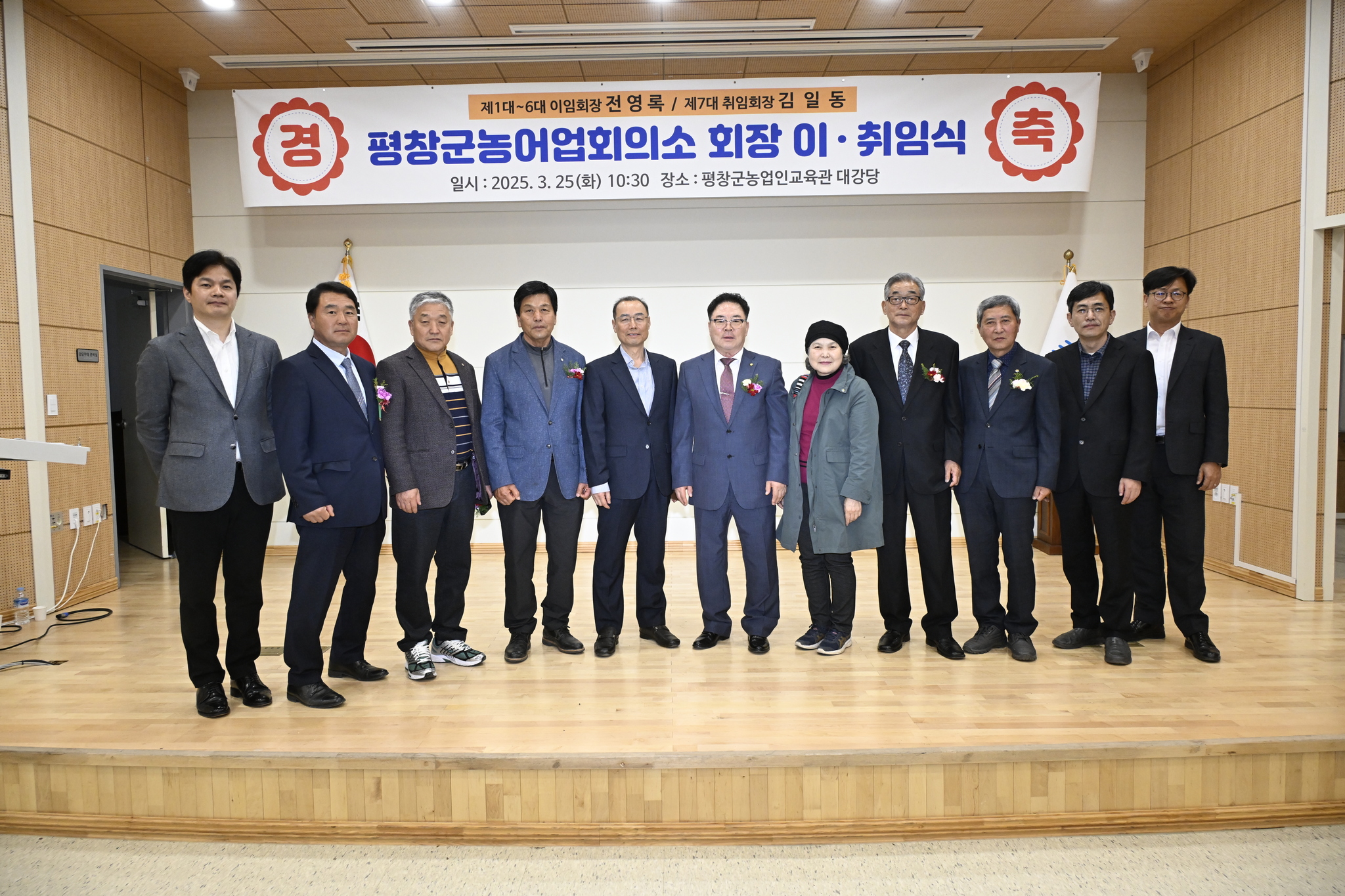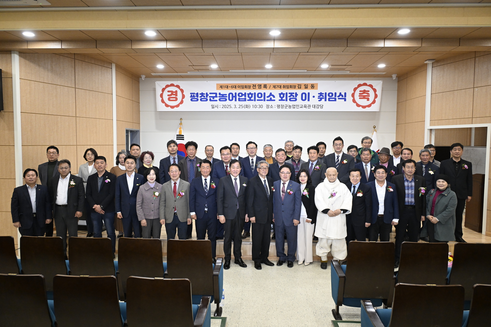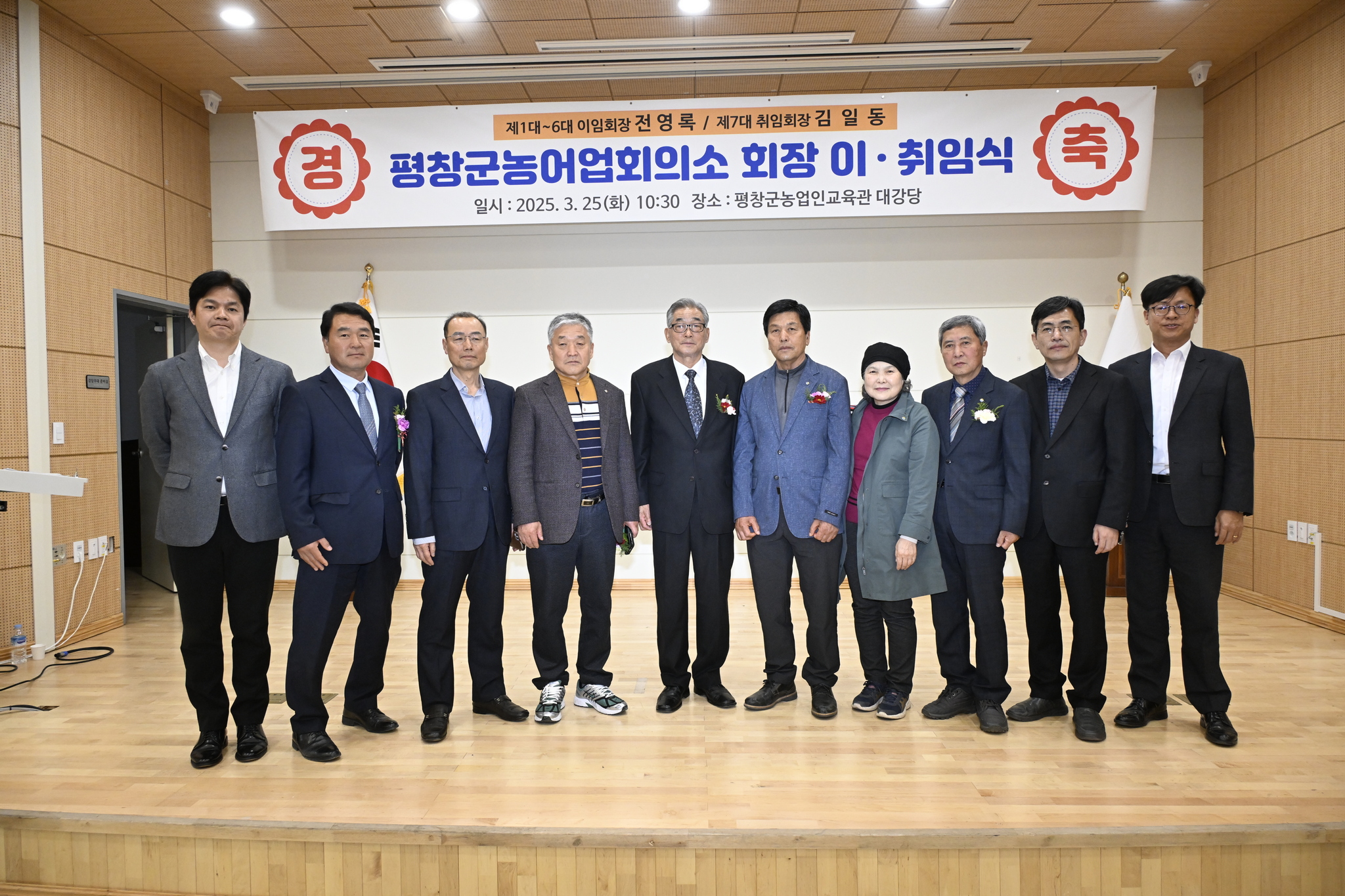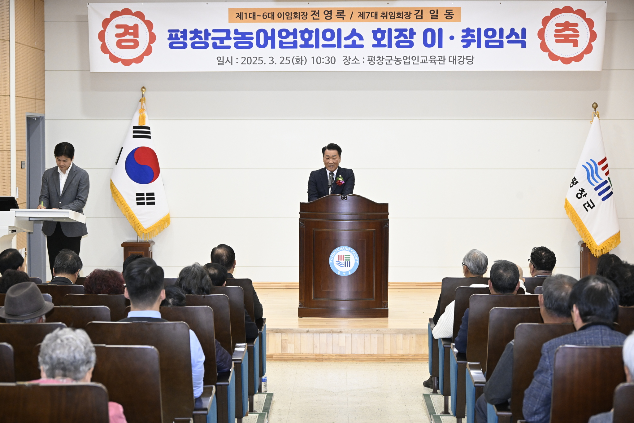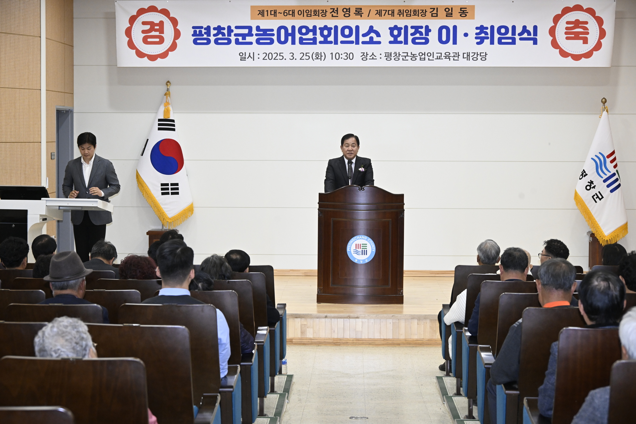 25일 평창군농어업회의소 회장 이·취임식(이임: 전영록 취임: 김일동)이 평창농업기술센터 농업인교육관 대강당(2층)에서 심재국 평창군수를 비롯한 남진삼 평창군의회의원과 의원, 최종수 지광천 강원특별자치도의회의원 등 기관사회단체장과 김제열 농어업회의소전국회의 회장을 비롯한 농어업회의소 관계자 100여 명이 참석한 가운데 있었다. (평창포토뉴스 김춘호)