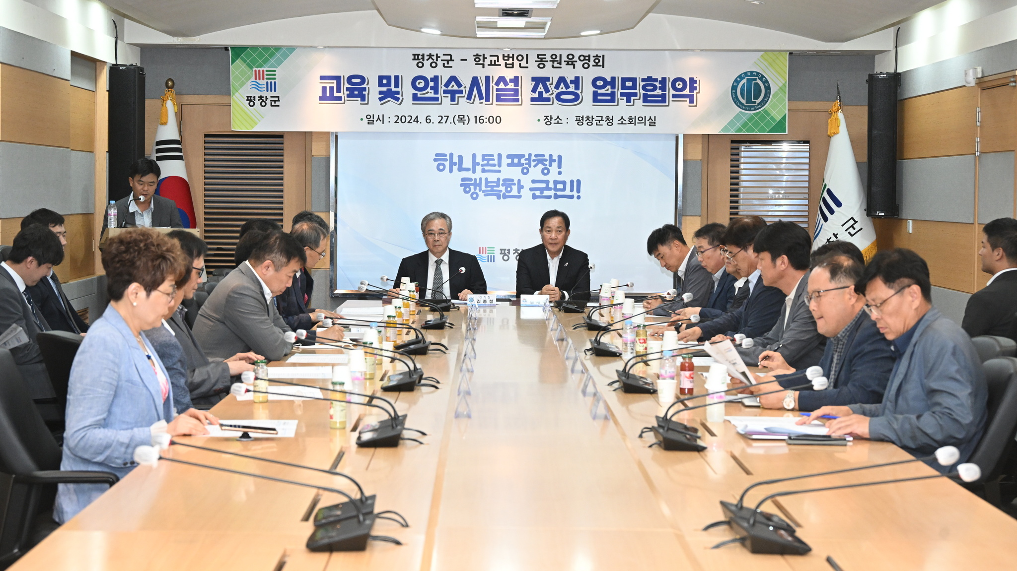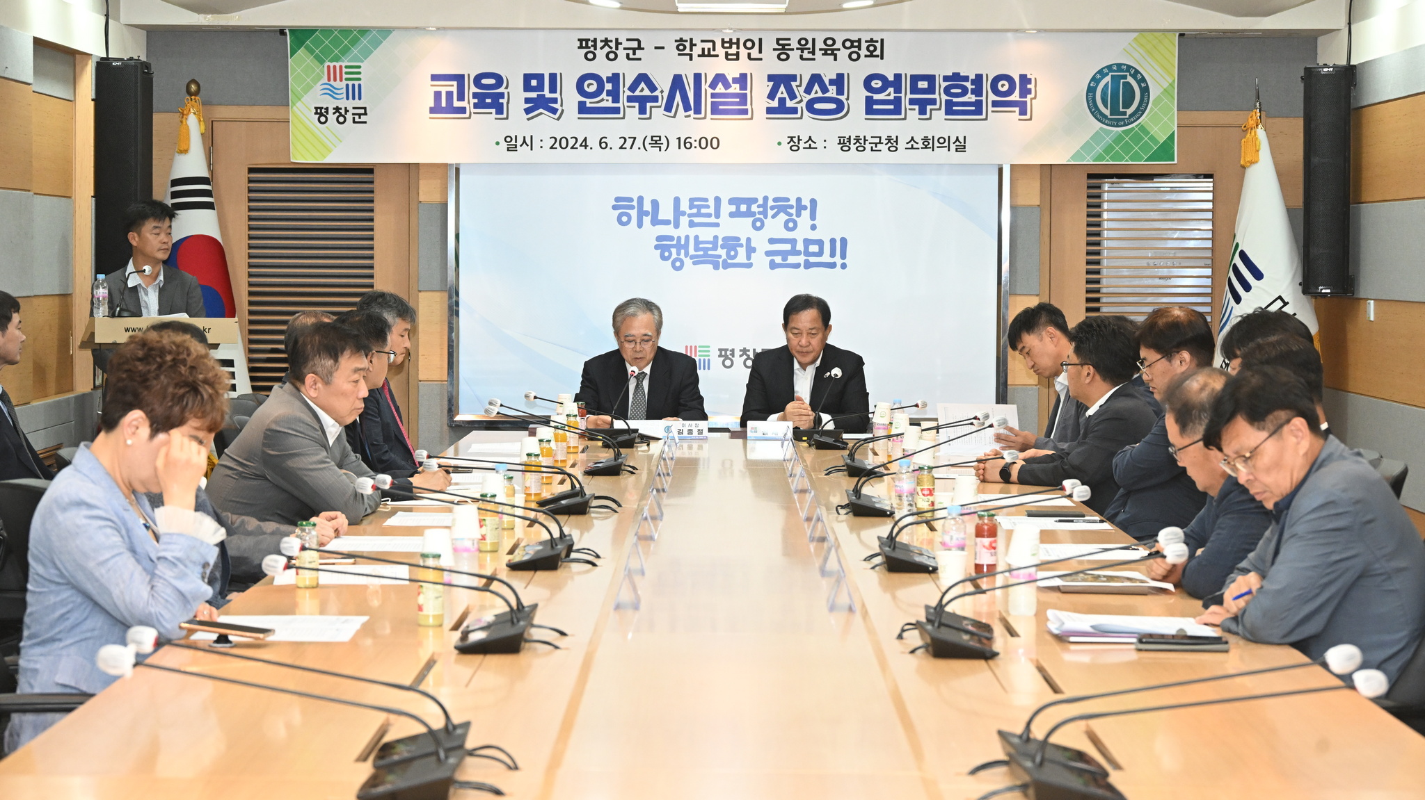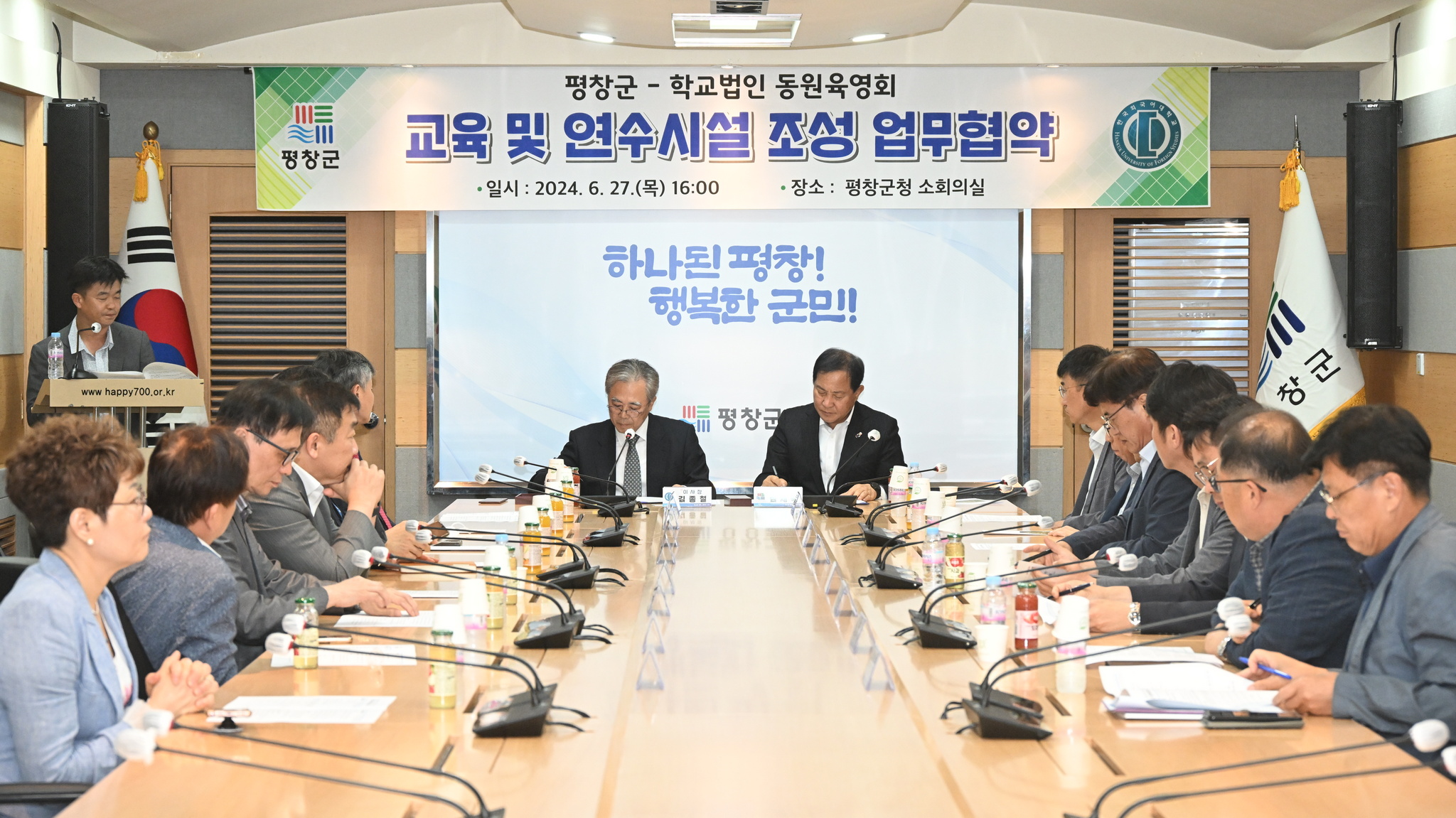 27일 평창군(군수 심재국)과 학교법인 동원육영회(이사장 김종철)은 평창 군청 소회의실에서 동원육영회 교육 및 연수시설 조성을 위한 업무협약을 체결했다. (평창포토뉴스 김춘호)