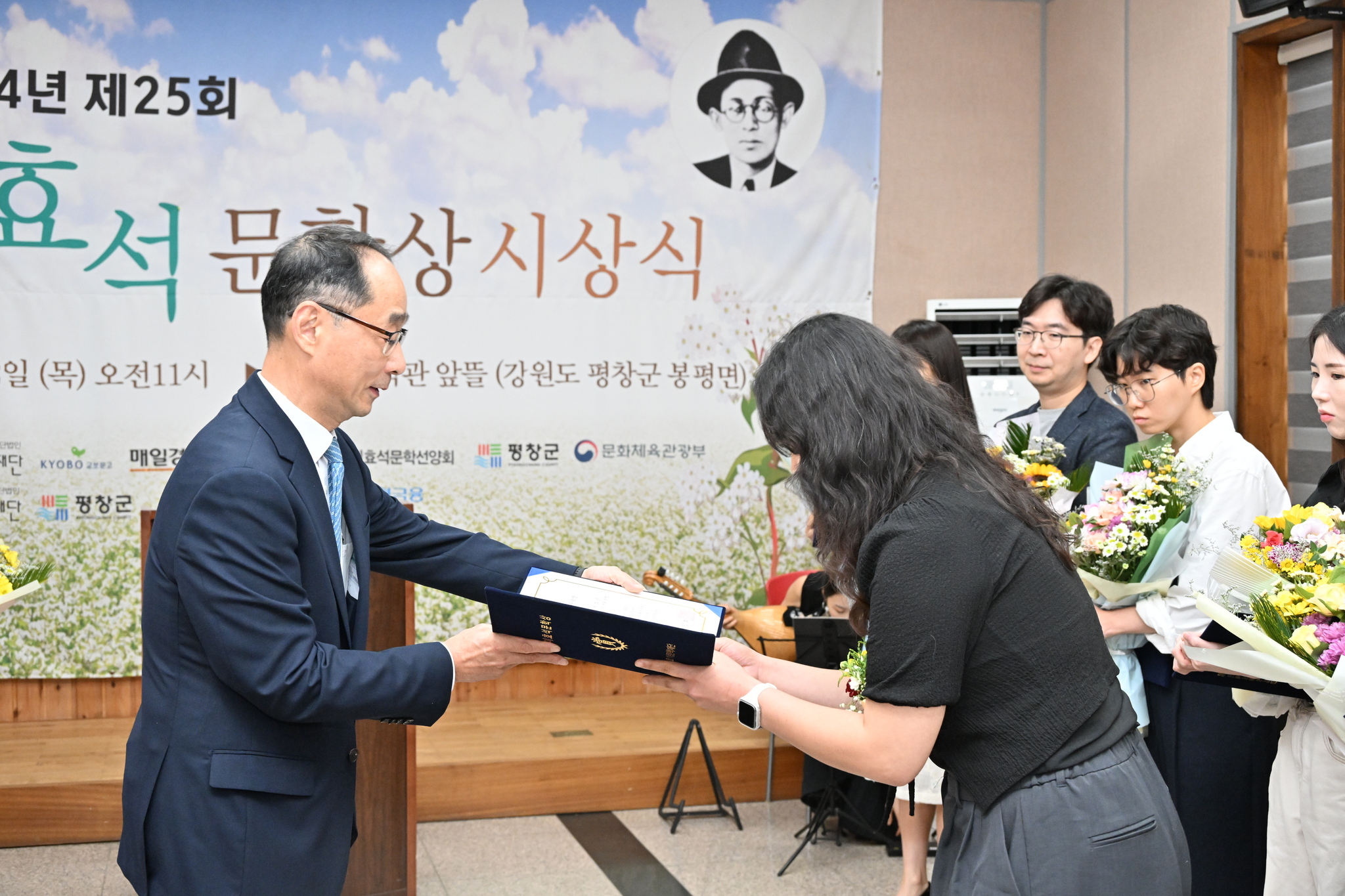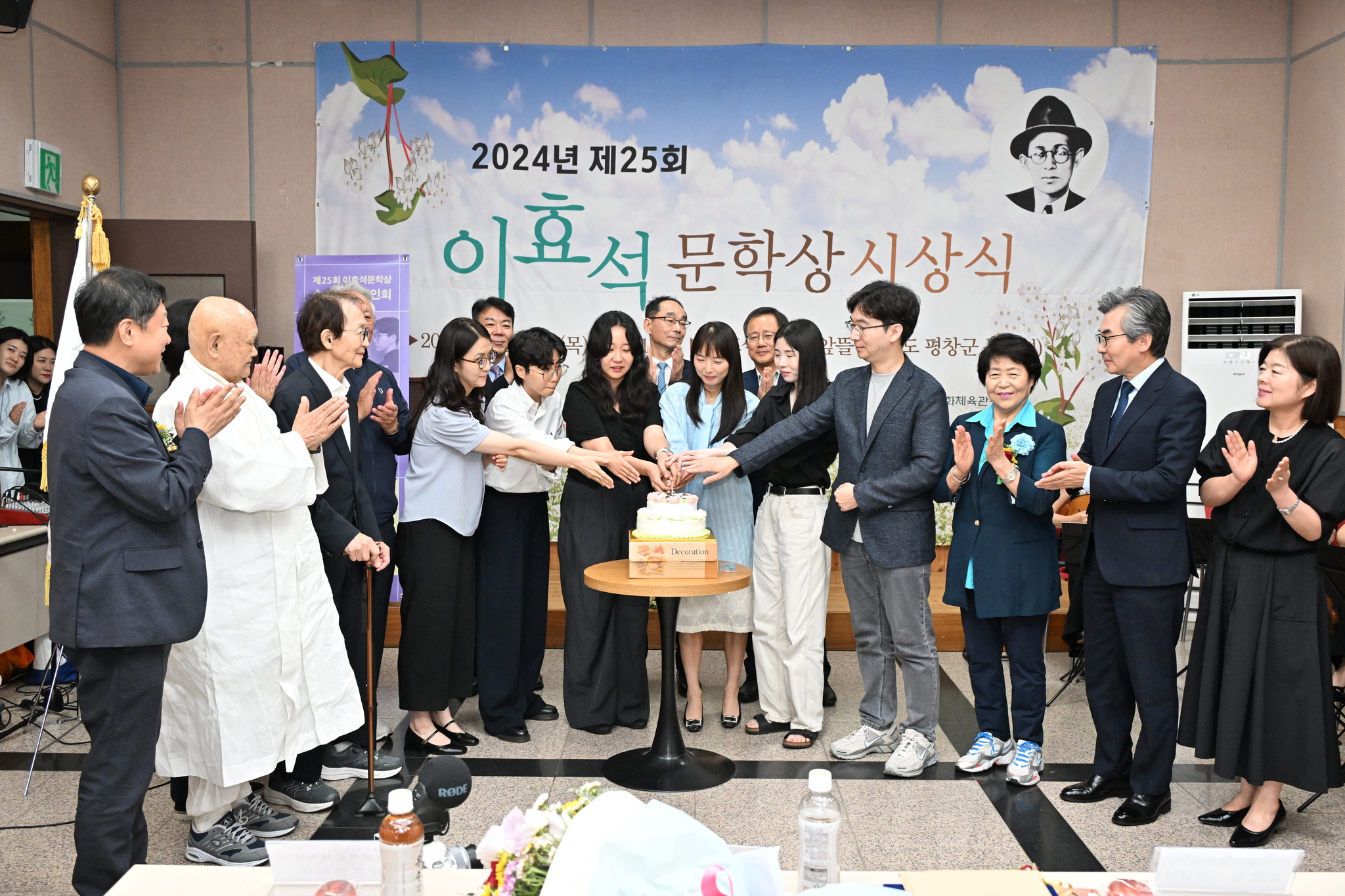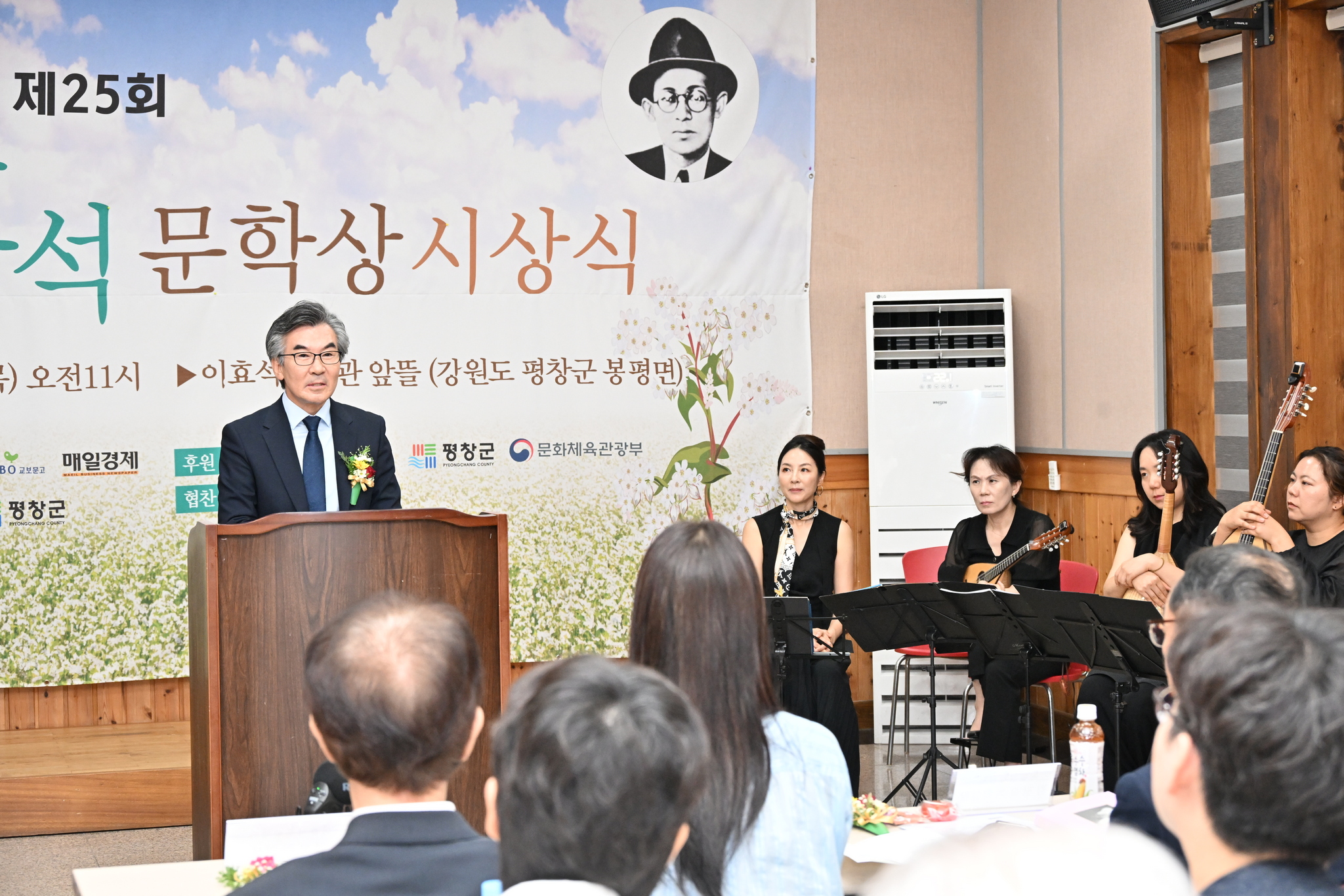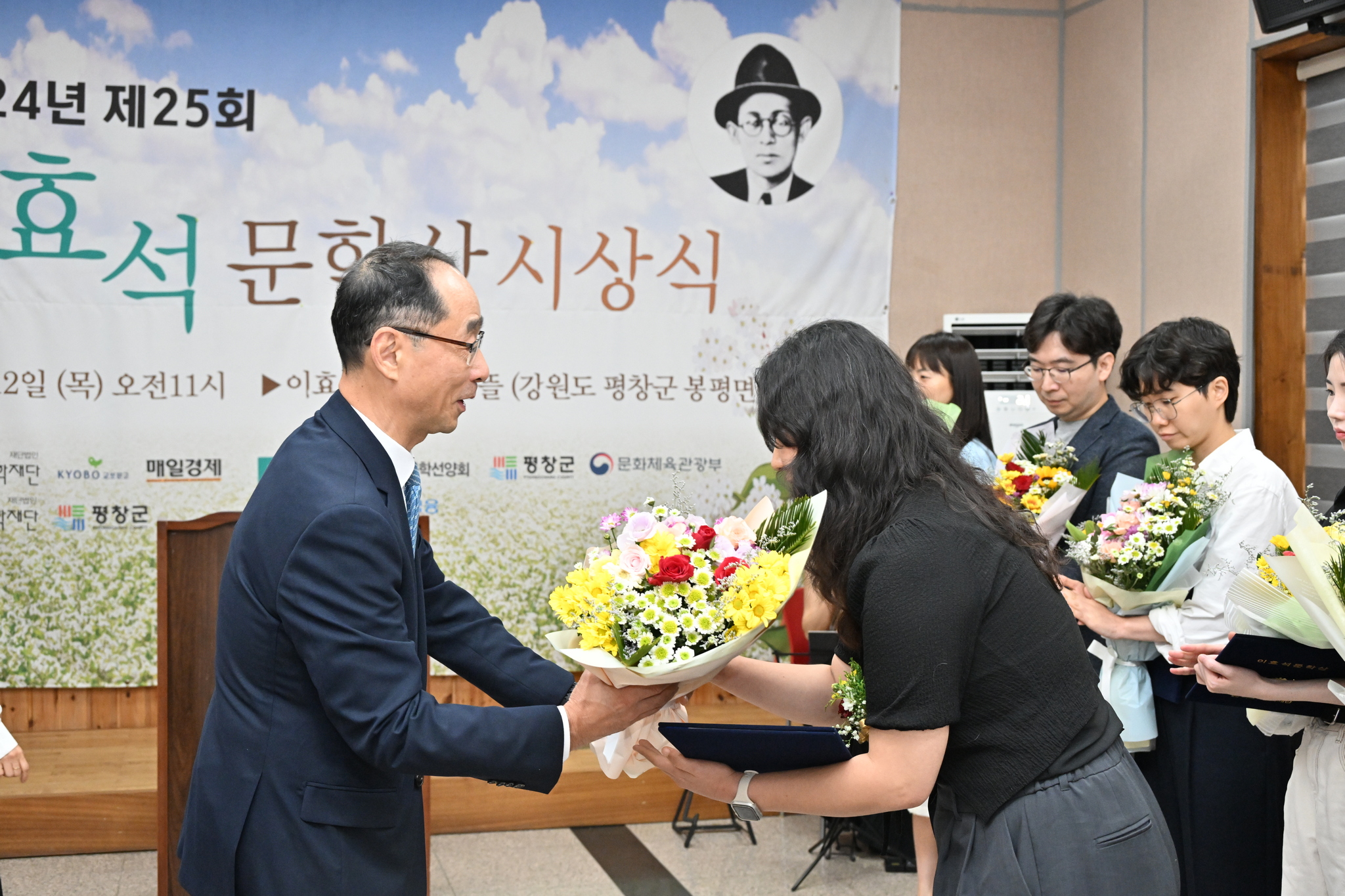 12일 재25회 이효석문학상 시상식이 이효석문학관에서 방민호 (사)이효석문학재단이사장, 이우현 이효석 선생 장남, 김명기 평창군 관광경제국장, 김수연 (사)작은도서관만드는사람들 대표 등 내빈과 대상수상자인 손보미 작가를 비롯한 수상 작가 6명이 참석한 가운데 있었다. (평창포토뉴스 김춘호)