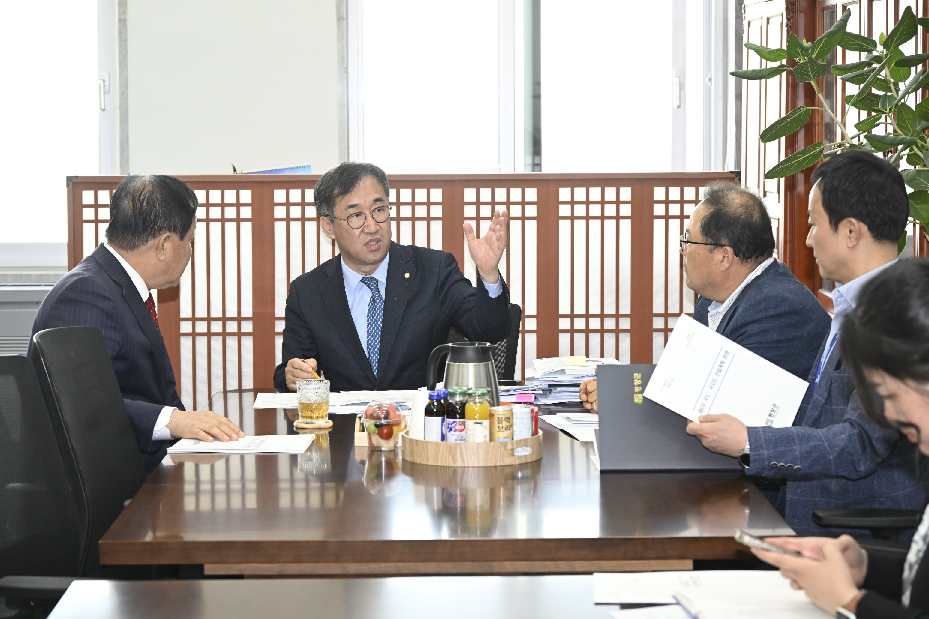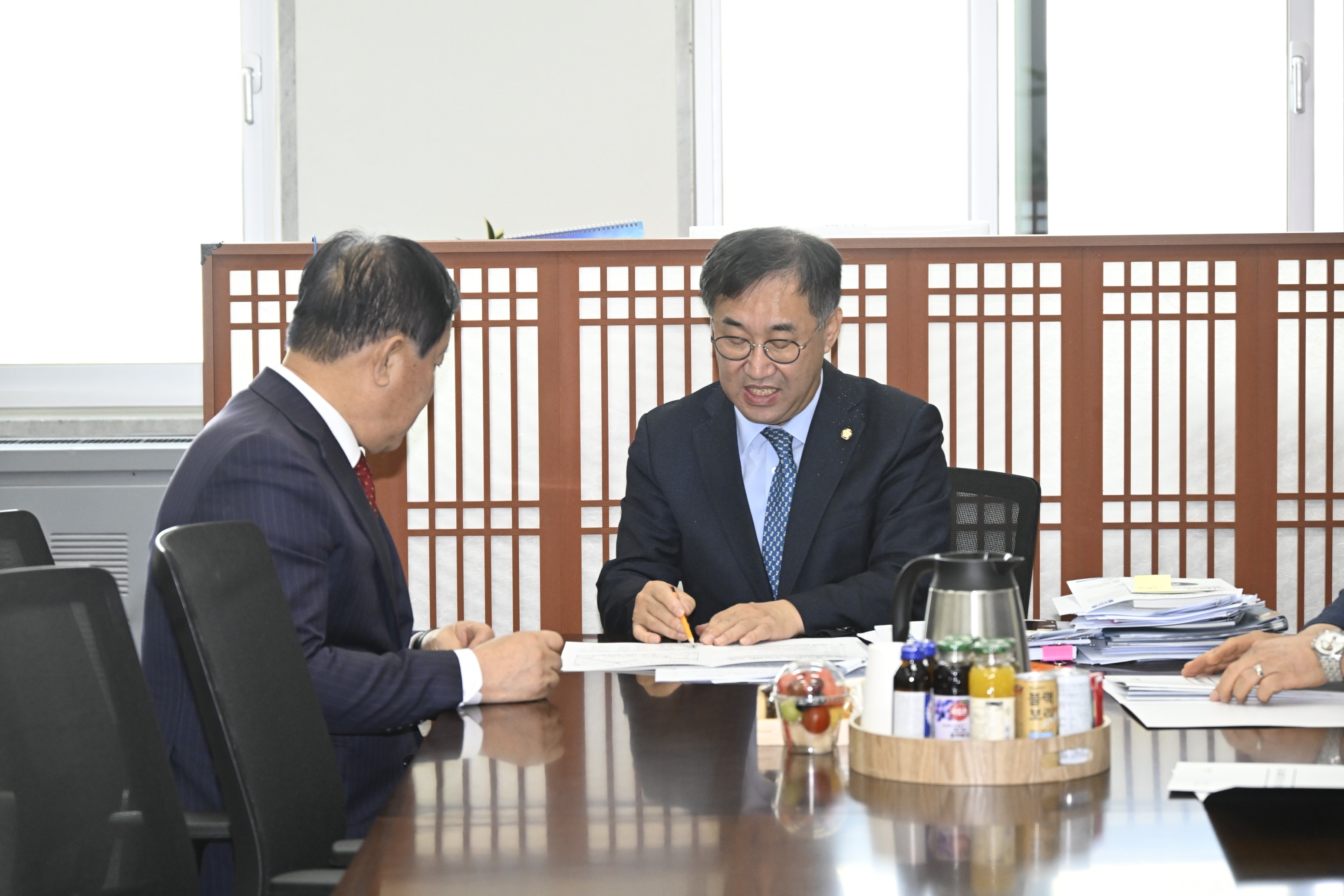 29일 심재국 평창군수는 국회 맹성규 국토교통위원회 위원장을 만나 제5차 국가철도망 구축계획에 제천~평창 철도사업 반영과 제6차 국도-국지도 건설계획에 중리~노론 4차로 확장, 주천~평창간 2차로 개량 사업의 반영을 위한 건의를 했다. (평창포토뉴스 김춘호)